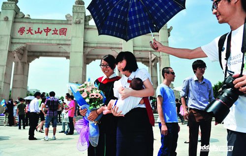 6月20日,曾佩伦抱着孩子与已经毕业的同班同学合影留念,她的丈夫风子在一旁打伞。
