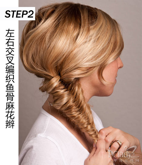 先将头发对半分成等同发量的两份,然后将两份头发再对半分开。用食指将最左外侧头发拉至右侧,再依次将最右侧头发交叉编到左侧发上。编鱼骨麻花辫时,将麻花辫最外侧一缕头发拉紧形成细密的鱼骨效果非常重要,其次是将左边最外侧部分的头发依次交叉到右半侧头发上,左右来回交叉编织,直到发梢。