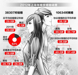 从电视上的各类相亲节目很火爆可以看出,如今找个人结婚正逐渐成为一件难事。事实也证明,现在年轻人结婚真的是越来越晚。去年南京人的总平均结婚登记年龄还是29.8岁,今年上半年,已上升到了29.9岁,离30岁大关也就差那么一点点了。快报记者分析发现,上升的0.1岁主要是由女性晚婚造成的。此次,南京还首次公布了初婚者平均年龄,在38307对结婚总量里,初婚者占82%,初婚者领结婚证时的总平均年龄是28.8岁,其中男性是28.7岁,女性是28.8岁。