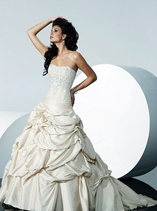 款式建议:宫廷式样的婚纱,有繁杂的手工缝制珠绣和层层叠叠的裙摆,金丝滚边增添华丽度。