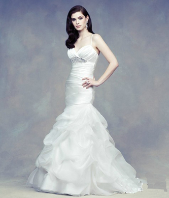 此款无带婚礼服上,羽毛装饰的胸衣成为特色