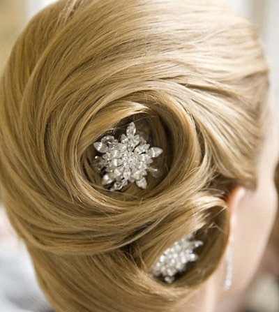 发髻优雅的盘成了两个旋窝,中心用钻石发卡点缀,分外精致。