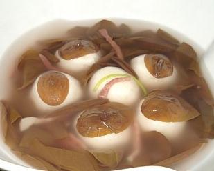 3)放高汤入锅,开了后加火腿丝稍滚开后,倒入鱼圆莼菜,小火养煮二分钟加少量盐即可,看那莼菜多象一张张小荷叶,滑溜的可不好夹的哦~~