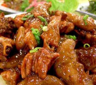 3、油烧到6成熟时,将鸡沥去卤汁放进油锅中炸熟,再将鸡捞出沥干油分后,将油倒出,只留少许,加入鸡、醋、麻油略炒,再倒入卤汁,起大火翻炒即可;