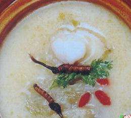鲜九孔鲍10只(约500g),虫草3根,水发金钩翅200g,高汤、绍酒、精盐、味精各适量。