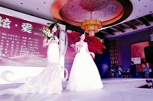 最“惊艳”的是,新娘子们出场所执捧花也都不是鲜花,有贝壳制作的,有用五彩缎带、英文报纸、复古纽扣制作的,看上去漂亮又时尚。据湖北省婚庆协会常务理事桂兵介绍,与以往新人不同,现在步入结婚阶段的85后年轻人,特别是海归新人,还多了一项环保的追求,环保也成了一种时尚,而婚礼上所用大量的鲜花,费用高,使用时间不长,重复利用率低,这才催生了环保婚礼,目前武汉的环保婚礼还在摸索中。