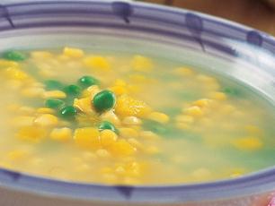 ②烧热锅,加水8杯和冰糖煮滚熔化,过箩筛,将糖水再倒入锅内,放入玉米、枸杞、菠萝、青豆煮滚,用生粉水勾芡即可。