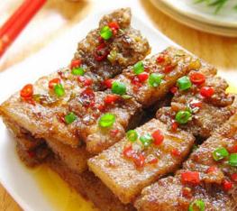 带皮五花肉400g、农家粘米粉150克、大料粉2茶勺、姜粉1/2茶勺、桂皮粉 1/3茶勺、葱段姜片适量、红椒末适量、葱末适量、盐1茶勺、料酒2大勺、酱油 2茶勺
