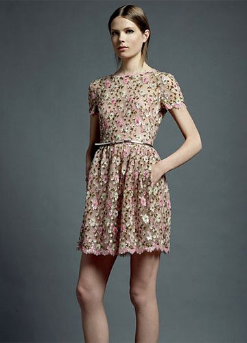 裸色花朵小洋装搭配裸色高跟鞋,低调而华丽。性感的睫毛蕾丝花边小女人气息十足。