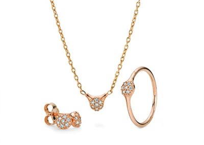 这款玫瑰金耳环款式简单,上面一个镶有小圆圈中间围绕着小粒钻石呈规则形状排列,下圆的大圈中间采用镂空的设计,将标志字母均匀的分布刻画在外围圈中。