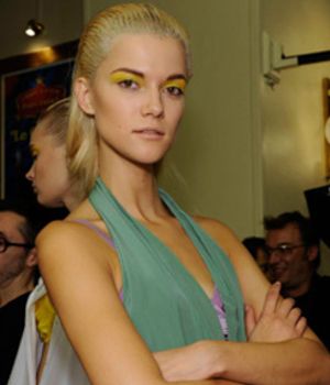 Step5:避开眼角3mm位置,在眼窝处使用粉蓝色眼影,下眼睑则用较深的蓝色,用眼线笔勾勒出粗又飞扬的眼线,立即展现欧洲美女的韵味。