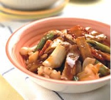 (3)起油锅爆香红辣椒末、葱段及蒜头,之后再加入花枝甜、花枝以及蒜苗拌炒至熟透,最后加入调味料拌炒均匀,再以太白粉水勾芡即可。
