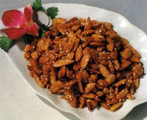 2.另取锅放油,烧至三四成热时放入榄仁,用小火慢慢地氽,见色橙黄时捞出,沥去油,撒上芝麻,放在板上轻轻地将其拨离松散,等全部冷却后装盘。