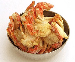 2 炒勺上火,注入花生油烧至8成热,将海蟹刀口断面处蘸淀粉后,入油中炸呈金黄色时捞起,两半蟹拼好码入盘中。蟹盖也入油中炸呈赤色,盖在炸蟹上恢复原样即成。