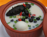 【特点】 色泽黑白相间,清雅悦目,海参滑绵柔软,鸡茸丸香嫩清鲜。