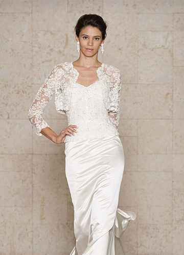 正如每到初秋都要为自己的衣柜添置几款针织衫、小西装一样,小外套同样可以在秋季的婚纱礼服造型中发挥自己的作用,当然材质会换成轻薄的纱与蕾丝,款式上也要注意与婚纱的呼应,例如用高腰剪裁的蕾丝长袖小外套搭配较为修身、材质较挺括的缎面婚纱礼服,塑造修长挺拔的身体线条,或是用轻盈的纱质褶皱外套搭配束腰蓬裙,突出纤细的腰线。