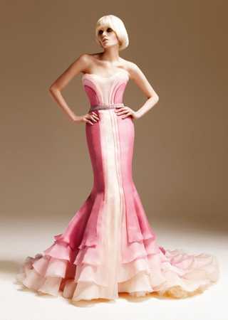 两手叉腰是很常见的拍照动作,但是很少有人能做出超模的范儿,这张姿势是绝佳的范本,轻抬下巴,肩部一上一下叉腰,配上粉色渐变修身鱼尾礼服,非常漂亮。