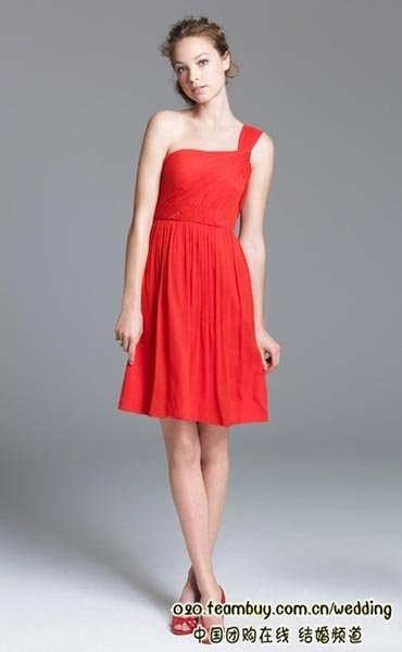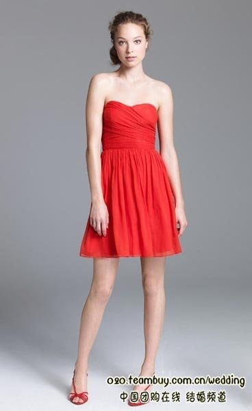 抹胸正红色的小礼服很是抢眼,但也能抢了新娘的风头。建议在新娘穿着中式礼服时,伴娘可以集体配合换上红色伴娘服。
