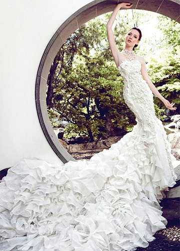 花瓣长拖尾尽显奢华,特别适合拍婚纱照时使用。将拖尾漂亮地摆在前面,正好为新娘增加线条感。
