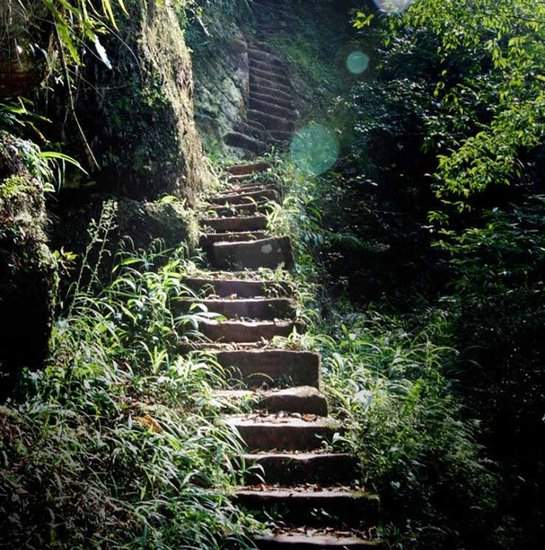 穿过桫椤林,眼前就是上山的路,路越来越难走,到后来,需手脚并用才能前进。有的地方是松木搭的桥,走在桥上,头上脚下全是翻滚的云海,感觉象在天上行走。大多数石梯都建在悬崖峭壁上,路面不足一尺宽。有几处几乎是90度的垂直峭壁,行进时,上面的台阶快碰着鼻子。这些石梯硬生生嵌在巨石里,云雾中,竖直向上延伸至一堆堆淡淡的云雾之中。