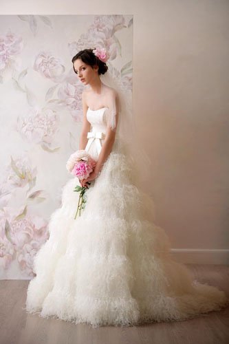款式非常具有小女人的可爱感觉,腰部的优雅蝴蝶结缎带装饰让公主感倍增。羽毛装饰的裙摆让新娘宛如白天鹅般美妙。