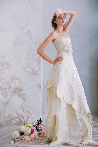 轻盈的雪纺纱适合年轻稚嫩的新娘穿着,平实的材质一样可以穿出可爱而飘逸的美感。