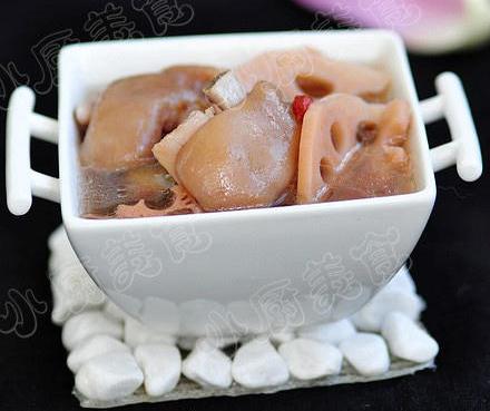 白嫩嫩的藕煮熟后变成了粉色,性质也由“凉”变“温”,可滋阴、养血。再加上猪手中丰富的胶原蛋白,内外滋养