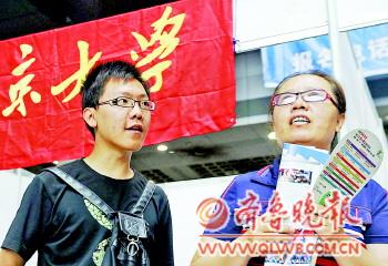 6月25日,在济南的高招咨询会上,一名考生从北京大学的咨询台前走过。(资料片)