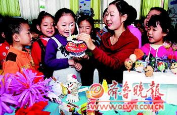 ◤孩子们在幼儿园老师的指导下,利用包装盒、饮料瓶等废旧物品制作成一件件可爱的玩具。(资料片)