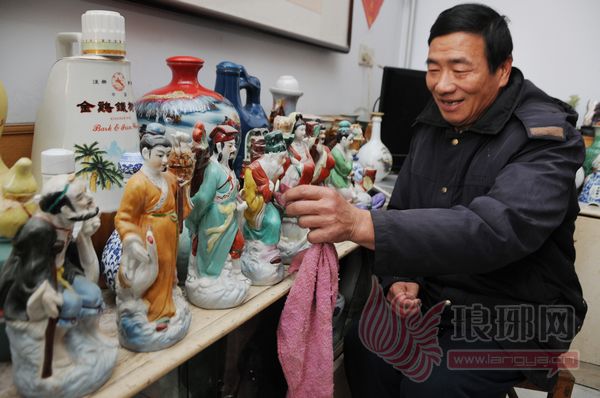 “一次偶然的机会,让我喜欢上了酒瓶收藏。”老臧说,2007年秋天,他和老伴在临沂照看小孙子,在社区里偶然捡到了一套十二生肖的酒瓶。老臧把酒瓶带回家,洗干净后细细端详,越看越喜欢。“虽然我不喝酒,但喜欢收藏有美感的东西。刚退休时,我喜欢收藏石头,后来喜欢上了收藏酒瓶,我连奇石都不爱了。”老臧说起酒瓶收藏,喜悦之情溢于言表。