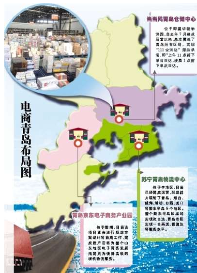 世界第二大、中国最大的自营电商企业——京东也谋划在青岛设立物流机构。2014年12月,青岛市政府与京东集团合作备忘录暨青岛京东电子商务产业园项目在胶州签约。该项目一期投资10亿元,建筑面积15万平方米,将建设山东半岛区域贸易结算中心、智能物流技术示范基地、区域采购中心、O2O模式试点等板块,形成集城市配送、信息处理、配套服务等多功能于一体的现代化、系统化、生态化的电子商务运营基地,打造山东地区等级最高、规模最大的电商产业园。记者从胶州市有关部门获悉,目前,该项目正在进行规划方案设计等前期工作,建成投产后将为整个山东地区电子商务发展搭建更为便捷高效的现代物流服务。
